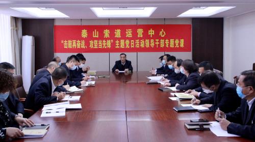贾代常号召中心各级党组织和广大党员干部员工,要紧紧围绕守初心、担使命,击鼓奋战再出发、放开手脚抓攻坚,让党旗在攻坚一线高高飘扬。他强调,要有敢于挑战的硬脊梁,对年初中心提出目标任务,要想方设法往前推进,让计划变成现实。要有抬头看路的自觉性,把重点任务分成几个小目标,逐个击破,为继续前行补充能量、坚定信心。要有履职尽责的真本领,做到专心、专注、专一、专业,在政治素养、道德素养、文明素养和业务技能方面得到全面提升,成为能够挑大梁、扛硬活、打硬仗的新时代泰山“挑山工”。要有心怀大局的高境界,自觉把岗位职责与中心重点任务对标对表,从实际出发、公开承诺,争做疫情防控的表率、安全运营的表率、增收创收的表率,推动中心各项工作不断迈上新台阶。