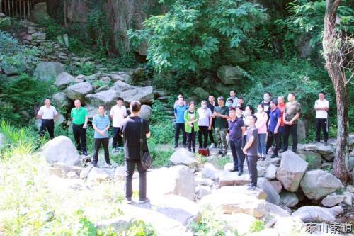 在老一辈泰山林场工人居住的山洞前,市委党校许圣元教授动情地讲述了泰山林场工人艰苦创业、绿化泰山,将荒山变青山的感人事迹,全面诠释了泰山挑山工“埋头苦干、勇挑重担、永不懈怠、一往无前”的精神特质和坚韧品格。