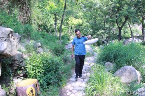 在崎岖的山路上,中心党委书记贾代常带头扁担上肩,其他党员紧随其后,挑起重物、负重前行,炎炎夏日、挥汗如雨,真切体验了泰山挑山工“挑担不畏难、重压不歇肩”的艰辛与执着。