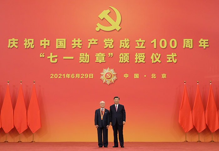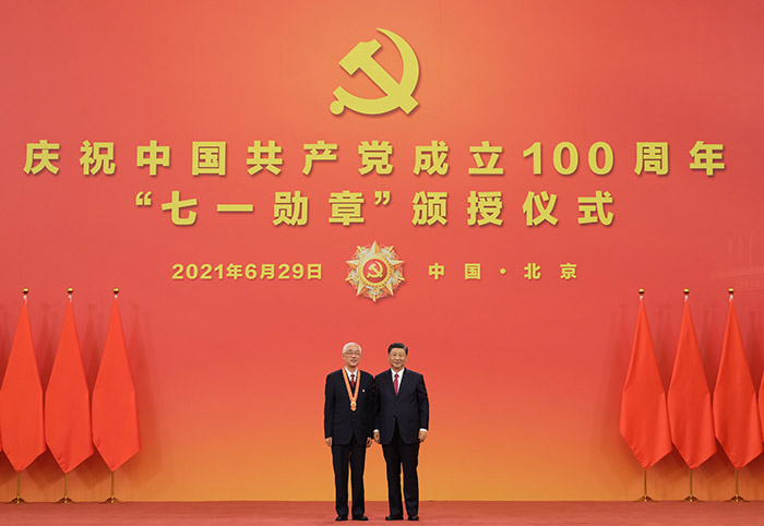 6月29日,庆祝中国共产党成立100周年“七一勋章”颁授仪式在北京人民大会堂金色大厅隆重举行。中共中央总书记、国家主席、中央军委主席习近平向“七一勋章”获得者周永开颁授勋章。新华社记者 李学仁 摄
