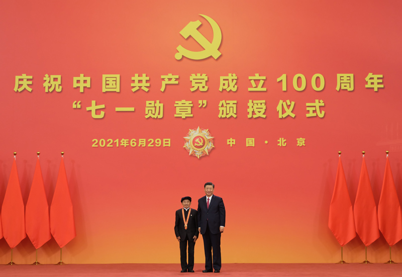6月29日,庆祝中国共产党成立100周年“七一勋章”颁授仪式在北京人民大会堂金色大厅隆重举行。中共中央总书记、国家主席、中央军委主席习近平向“七一勋章”获得者李宏塔颁授勋章。新华社记者 李学仁 摄