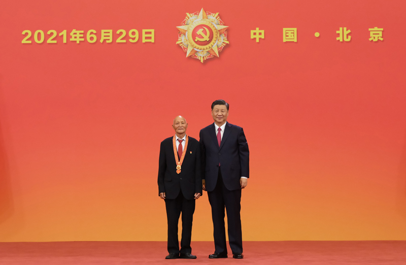 6月29日,庆祝中国共产党成立100周年“七一勋章”颁授仪式在北京人民大会堂金色大厅隆重举行。中共中央总书记、国家主席、中央军委主席习近平向“七一勋章”获得者崔道植颁授勋章。新华社记者 李学仁 摄